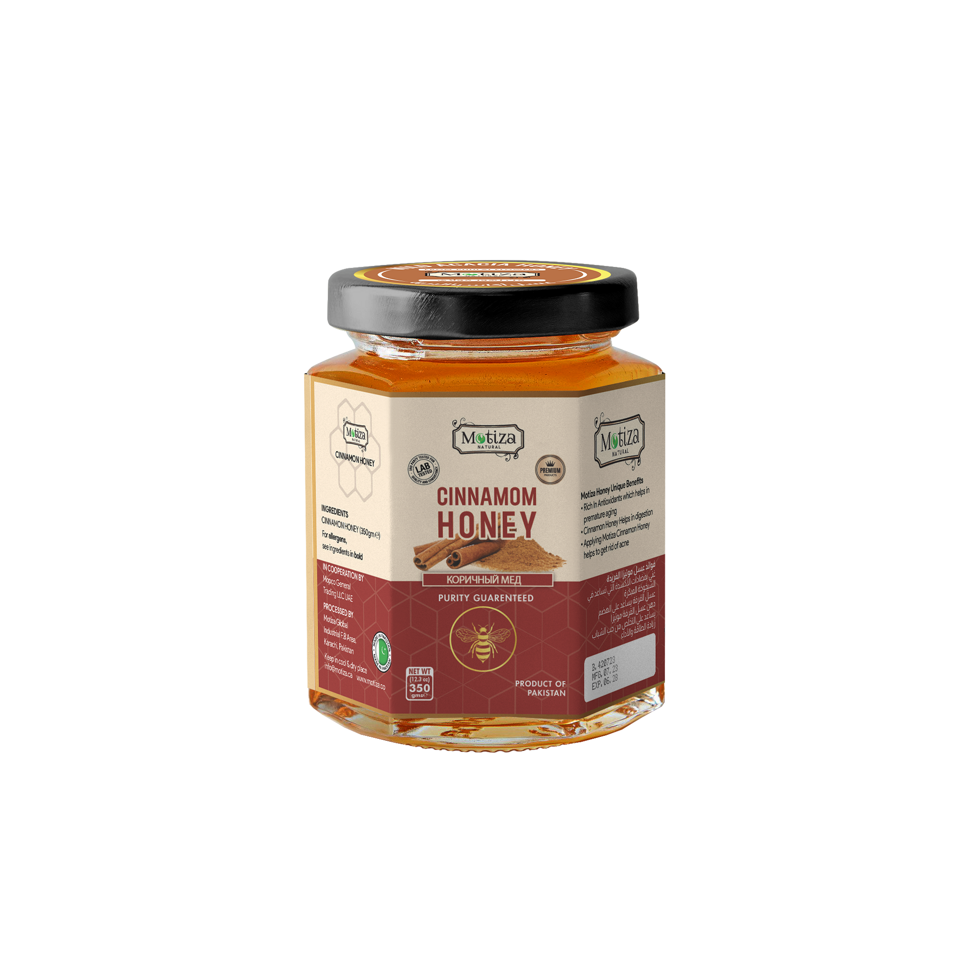 100% pure honey with authentic taste and fueled with nutrients - with a blend of cinnamon. Honey with cinnamon contains high in antioxidants, potassium, iron, B vitamins, proteins, phenol antioxidants, calcium, magnesium; manganese; potassium, phosphorus and zinc. (350 GM)